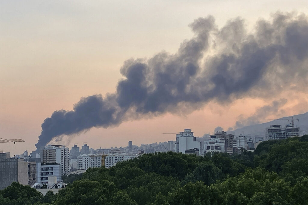 Smoke rises from the building of Iran’s state-run television after an Israeli strike in Tehran, Iran, Monday, June 16, 2025. (AP Photo)